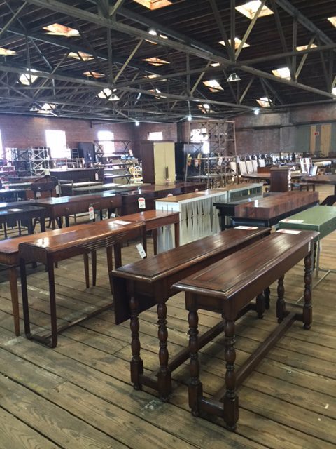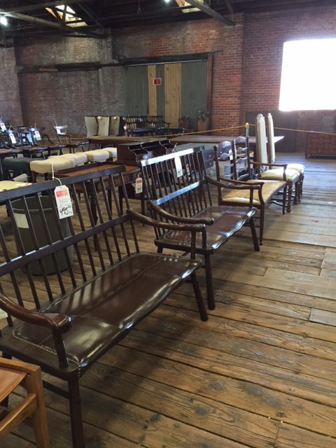 Bulluck’s Gigantic Warehouse Sale takes place in an old tobacco warehouse in downtown Rocky Mount. The warehouse is full of fine furniture, lighting and decorative accessories. Row and rows and rows of tables are set up and covered with lamps, bowls, statues, brass, art, vases, pots, candlesticks and more. Chandeliers hang from the rafters, mirrors and art are hung on the walls. Furniture of every type (contemporary, traditional and transitional) are out on display with prices slashed. Even outdoor furniture is included. The furniture is just beautiful! Bed frames, china cabinet, dining room tables and chairs, end tables and more. Â The smell of leather is wonderful! Leather couches, leather office chairs and leather formal chairs all on sale.
