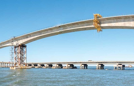 Workers are attaching the final metal rails on top of the finished barriers. The bridge will have two 12-foot-wide lanes with 8-foot shoulders for cyclists, pedestrians and disabled vehicles. The old one has only a 2-foot wide shoulder.